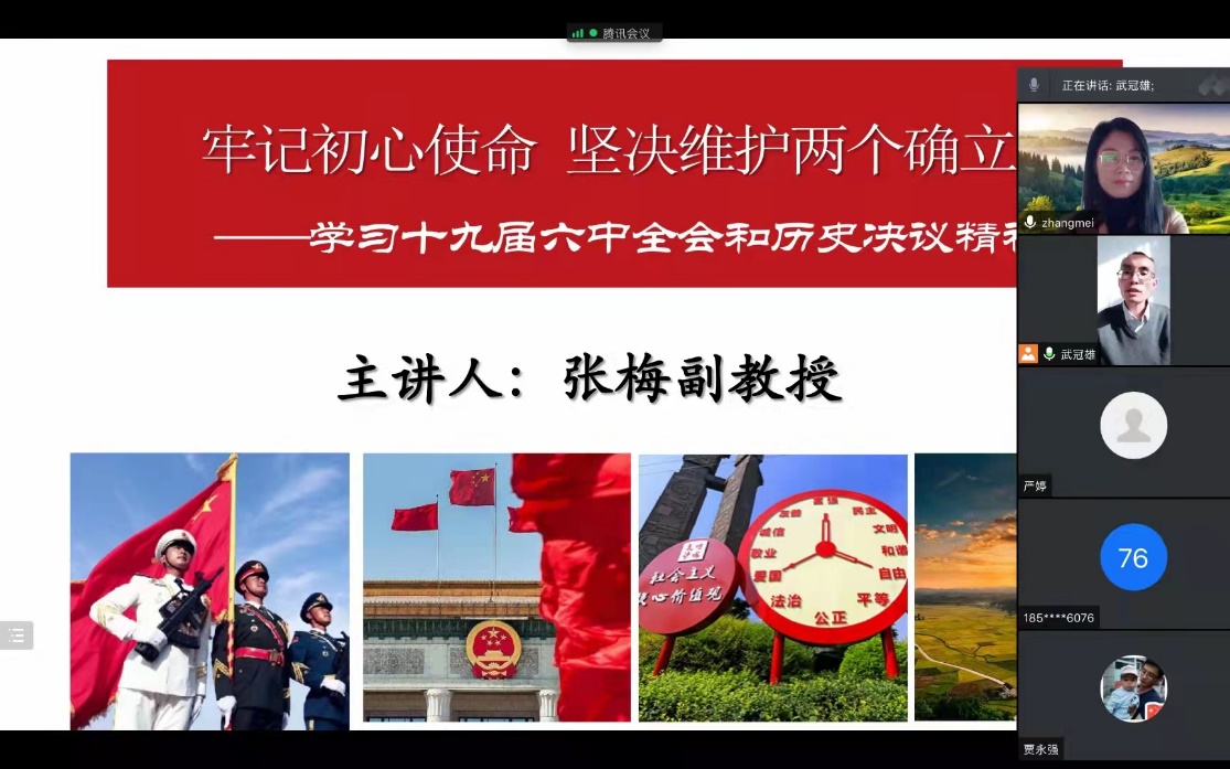 张梅以《牢记初心使命 坚决维护两个确立——学习十九届六中全会和历史决议精神》为主题,从三个方面对会议精神进行了详细的阐释。一是十九届六中全会的议程、重大成就和意义;二是《历史决议》的主要内容和重大创新;三是全面贯彻落实十九届六中全会精神。最后,她强调:在全面建设社会主义现代化国家新征程上,要高举习近平新时代中国特色社会主义思想伟大旗帜,不忘初心、牢记使命,学理论,听党话,跟党走,为实现中华民族伟大复兴而奋斗。